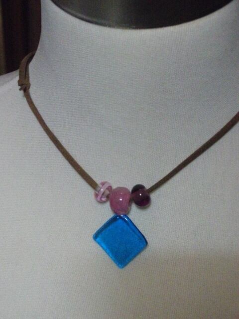 キルンワークとバーナーワークで制作した珍しい形のガラストップでデザインしたネックレス。