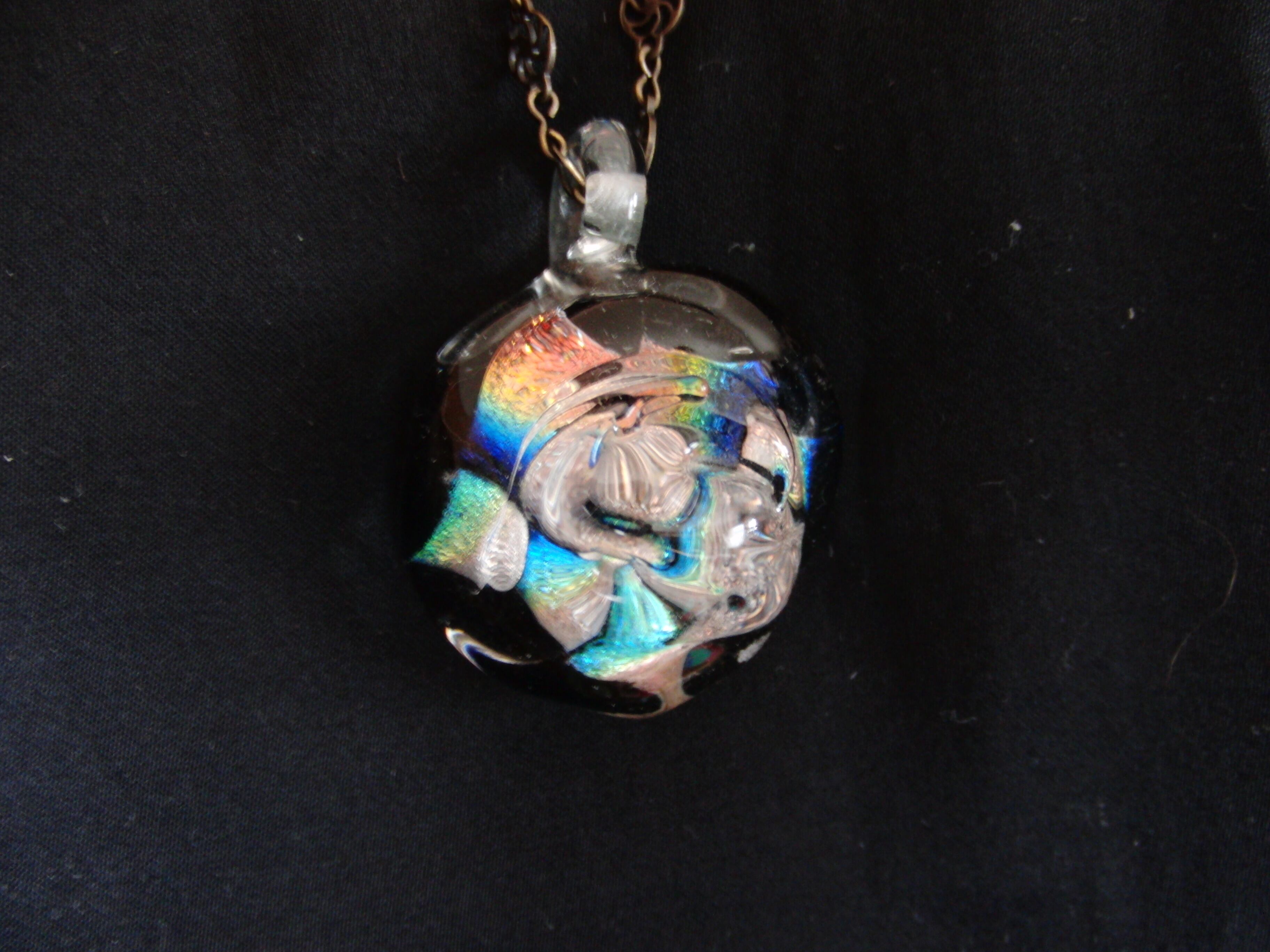 ダイクロガラスをクリアガラスでランダムに巻き、ネックレスに仕上げました。